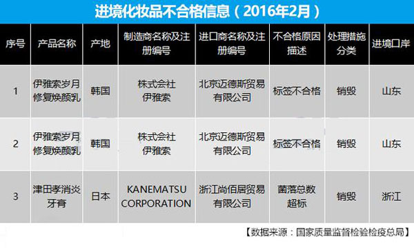 2016年3月29日,国家质量监督检验检疫总局发布了2016年2月进境不合格食品、化妆品信息共120批次,其中,不合格化妆品有3批,分别为伊雅索岁月修复焕颜乳和津田孝消炎牙膏。